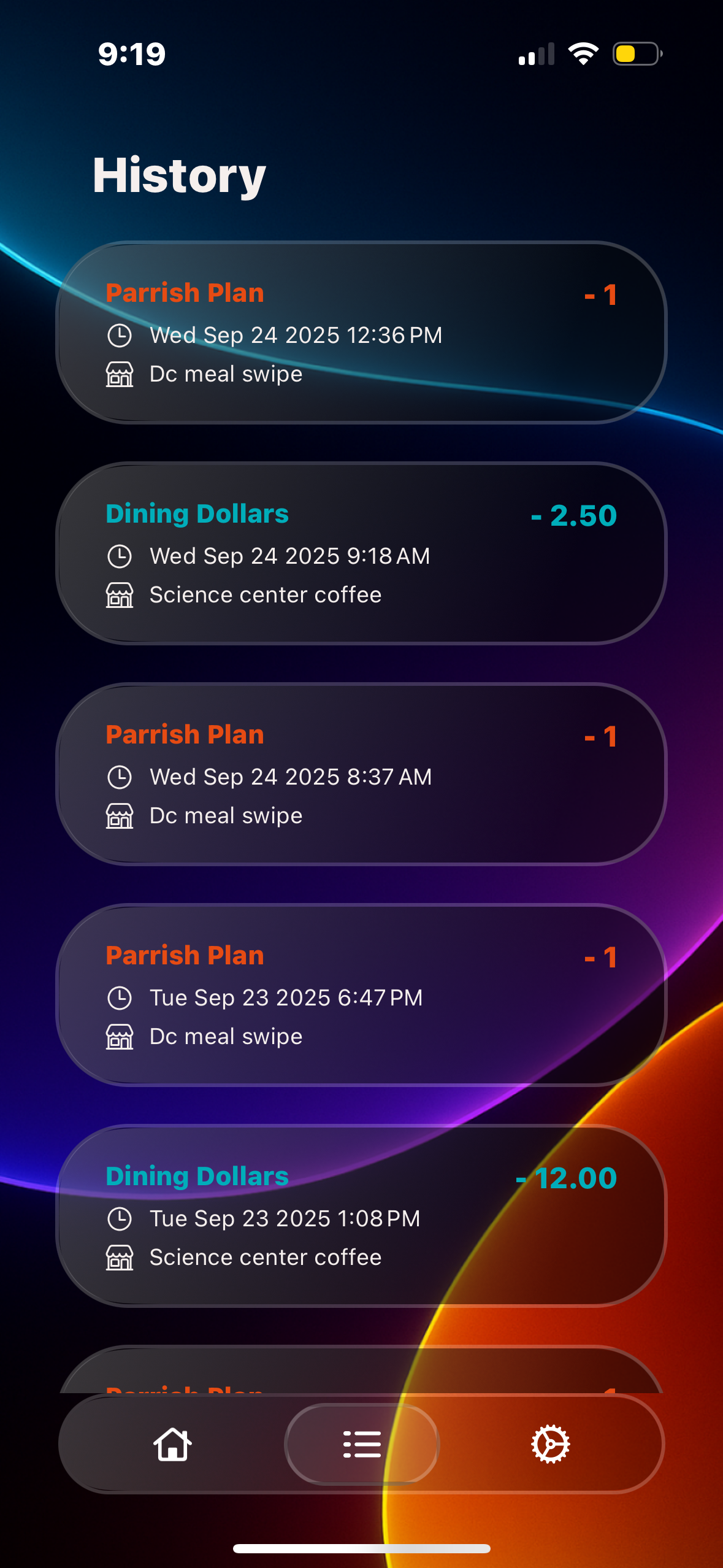 Budget Buddy is an iOS app designed to help students track expenses, manage meal-swipe budgets, and build better financial habits. The app bridges a common gap on campus — providing an easy way to visualize spending from school-provided funds in one place.